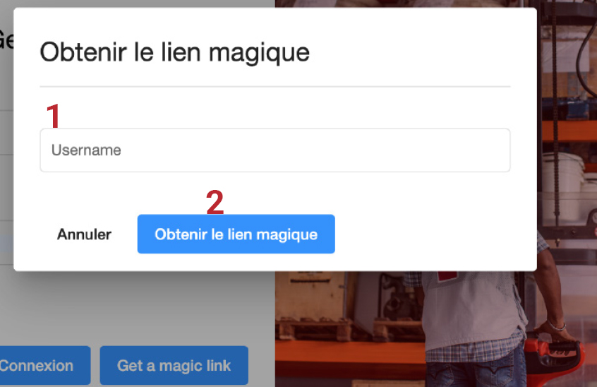 En cliquant sur obtenir un lien magique vous serez redirigé vers une nouvelle fenêtre vous demandant de renseigner votre nom d’utilisateur pour obtenir le lien par mail.