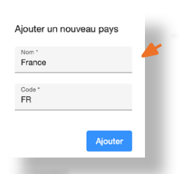Le bouton "Nouveau pays" permet d’ajouter un nouveau pays, pour se faire cliquez dessus, saisissez le nom du pays et le code (regarder le listing ISO pour attribuer les codes pays) ensuite cliquez sur « Ajouter » pour valider.