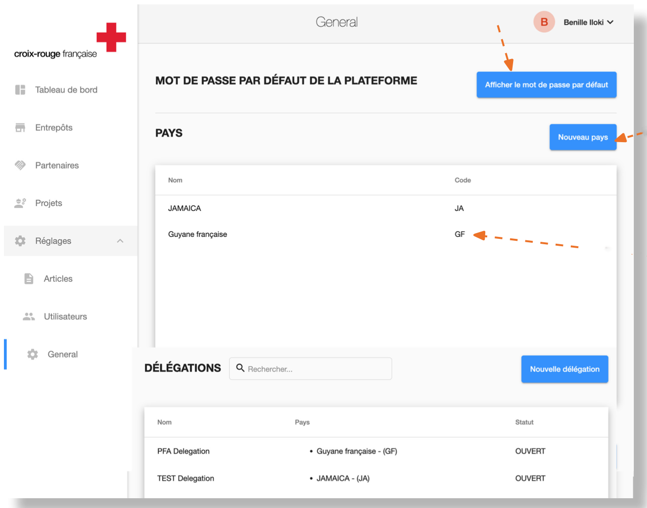 Le menu « General » est composé de la liste de pays, délégations déjà enregistrées et 3 options disposées de façon verticale du côté droit dont les rôles sont expliqués ci-dessous. Seuls les administrateurs globaux ont accès à ces fonctionnalités.