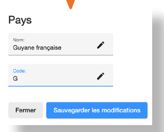 Pour modifier ou supprimer un pays, veuillez cliquer sur le pays souhaité puis sur « Supprimer ». Pour modifier, cliquer sur le crayon à droite du champs de texte. Validez en cliquant sur « Sauvegarder les modifications »
